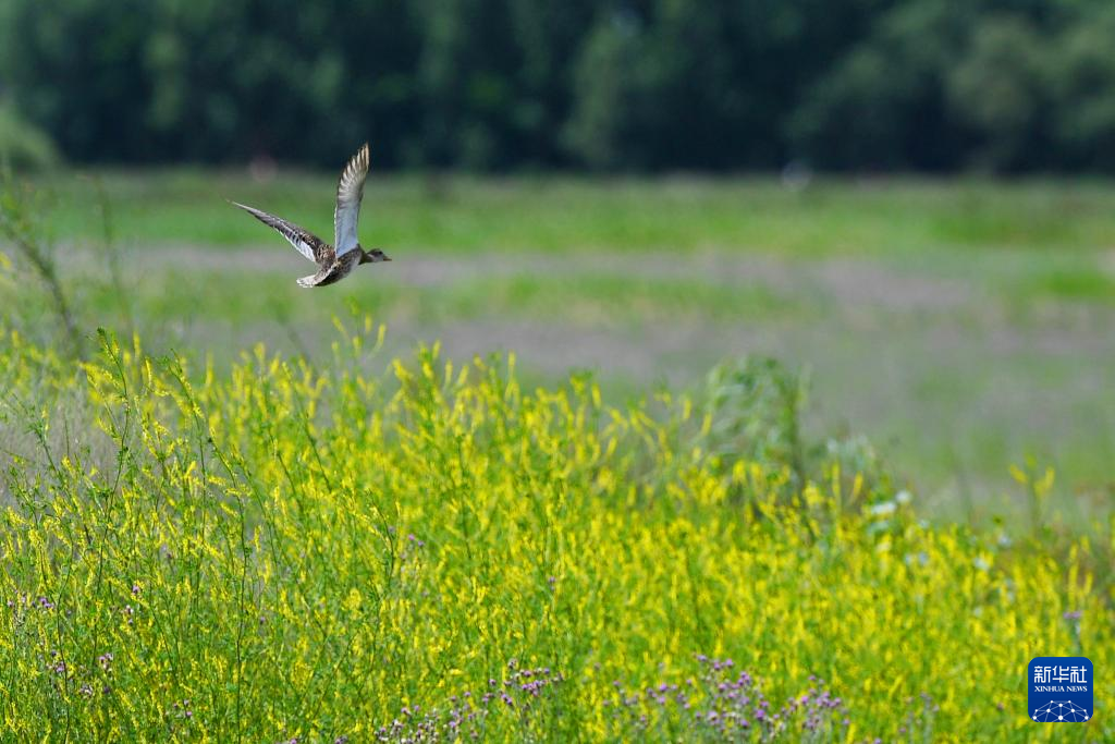 绿头鸭在拉鲁湿地飞翔(7月23日摄)。新华社记者 张汝锋 摄