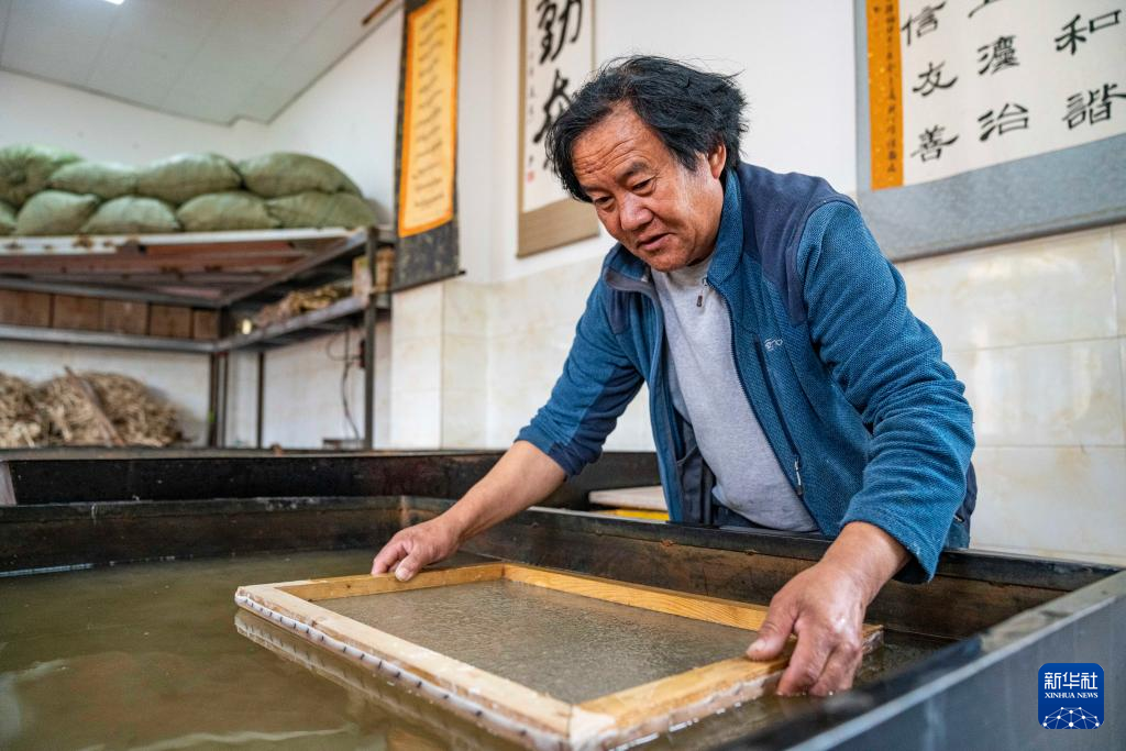在西藏米林市羌纳乡西嘎门巴村,南迦巴瓦童螺嘎布工艺品农民专业合作社的工作人员正在制作藏纸(7月26日摄)。新华社记者 孙非 摄