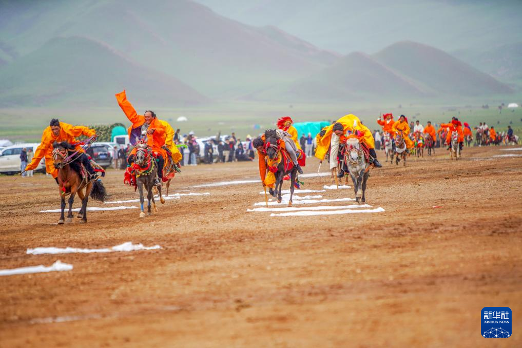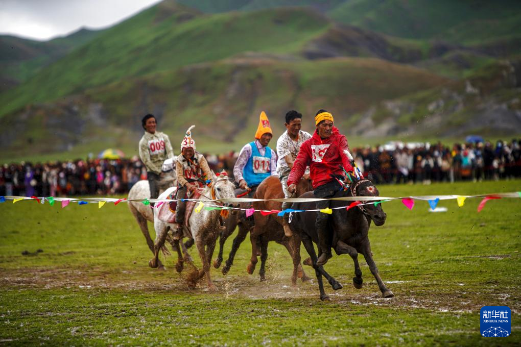 新华社拉萨8月3日电(记者刘洲鹏、邵泽东)3日,在西藏自治区日喀则市昂仁县桑桑镇的赛马场上,来自贡久布乡的选手嘎玛索朗穿着华丽轻便的赛马服,上身随着黑色马背起伏,左手紧拽缰绳,右手挥舞马鞭,正进行最后冲刺。骏马飞驰,在雨后松软的泥土上留下蹄印。