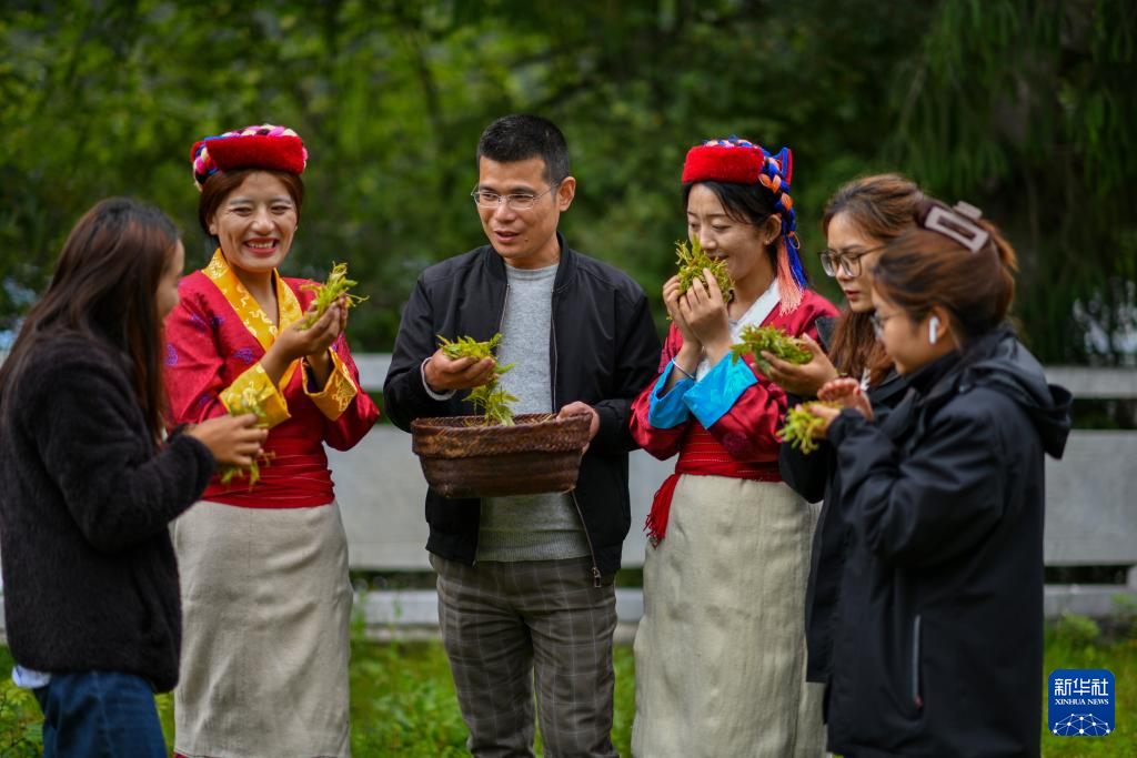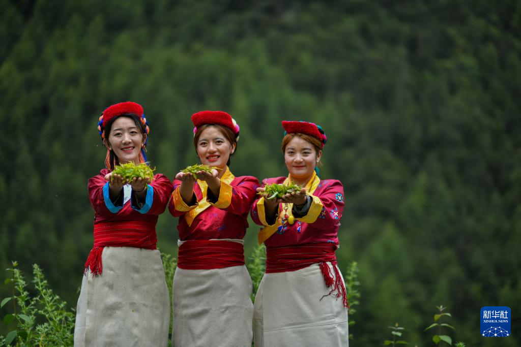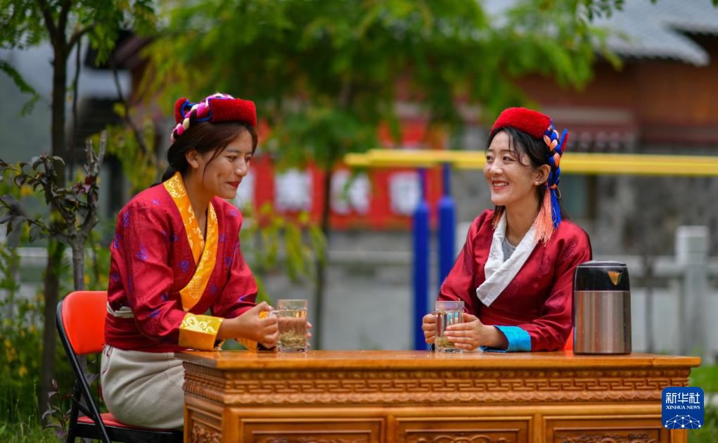 错那市贡日门巴民族乡斯木村第一书记尼玛卓玛(右一)在与村民一起品尝莓茶(7月28日摄)。