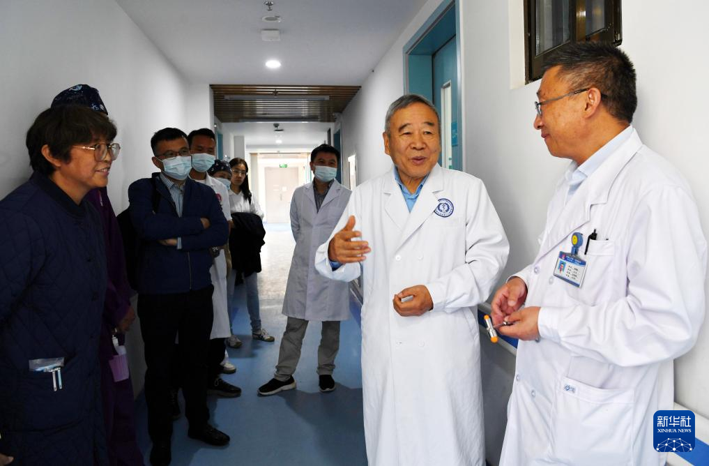 8月10日,中国科学院院士、首都医科大学附属北京天坛医院神经外科学中心主任医师赵继宗(右二)和西藏第二人民医院的医生在医院病房走廊里交流。新华社记者 张汝锋 摄