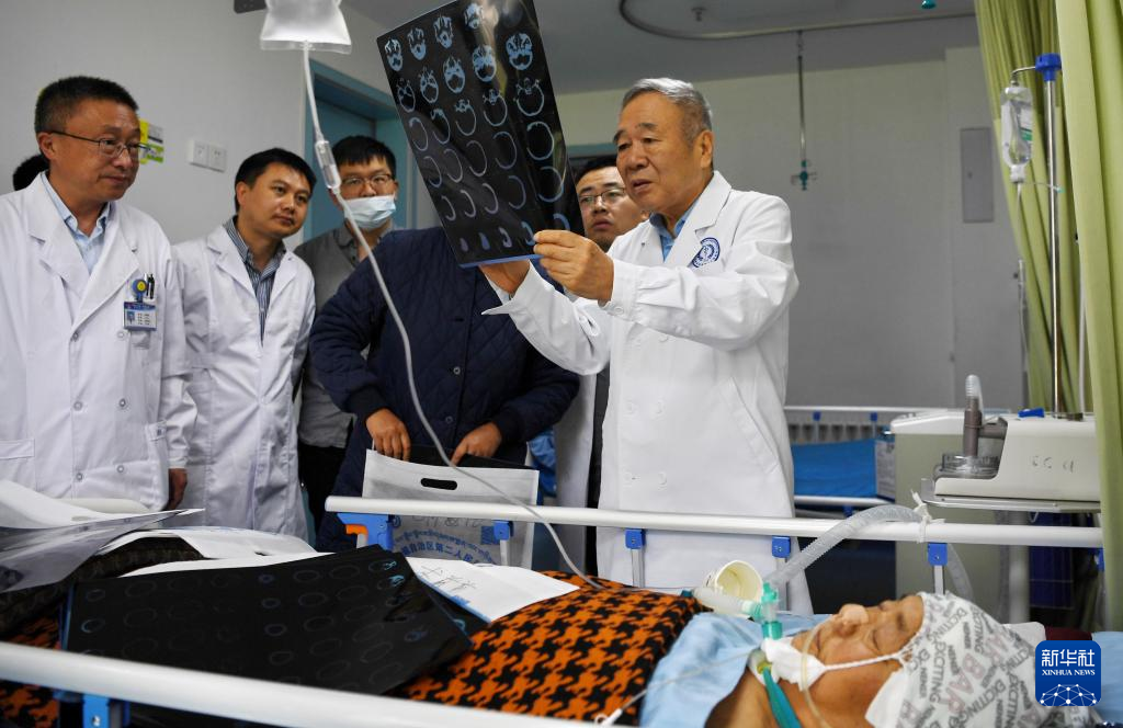 8月10日,中国科学院院士、首都医科大学附属北京天坛医院神经外科学中心主任医师赵继宗(左三)和北京天坛医院神经外科学中心主任医师仇汉诚(左二)进行教学查房。新华社记者 张汝锋 摄