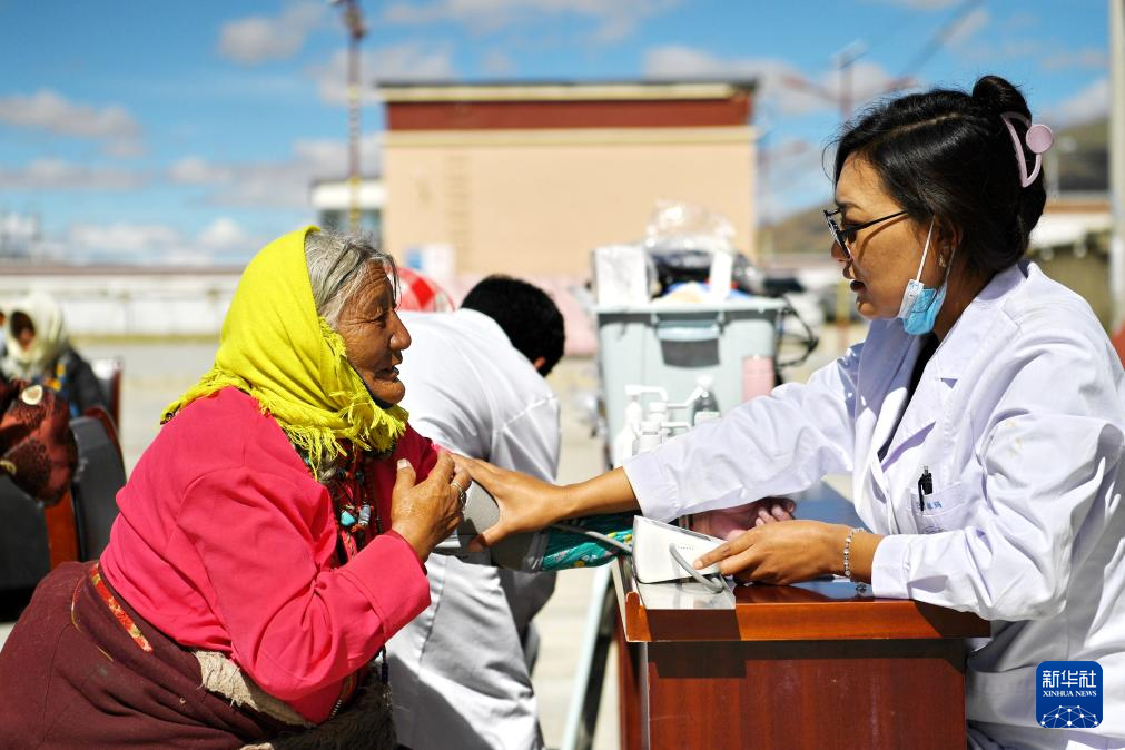 8月18日,在阿里地区措勤县曲洛乡,乡卫生院医生巴桑卓玛为一名老人测量血压。新华社记者 张汝锋 摄