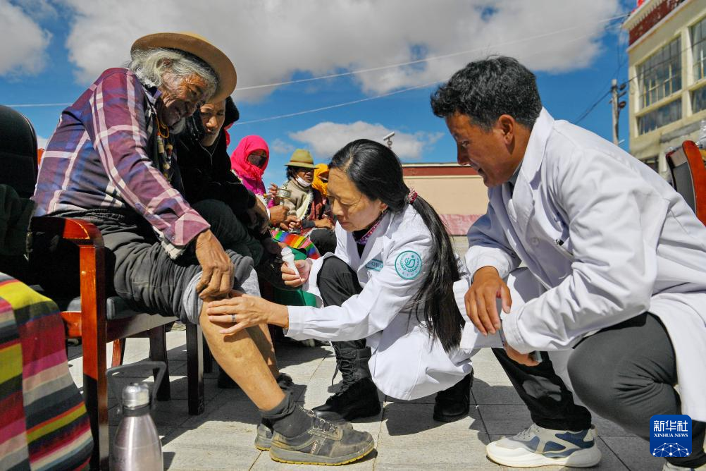 8月18日,在阿里地区措勤县曲洛乡,西藏阜康肿瘤医院康复理疗师唐颖(右二)为当地群众义诊。新华社记者 张汝锋 摄
