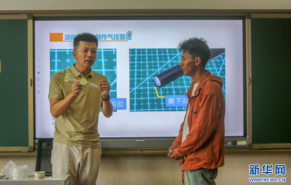 在《航空模型制作》课上,北京市少年宫科技教学部教师张文龙(左)正在与拉萨本地教师进行互动(8月23日摄)。新华社记者 邵泽东 摄