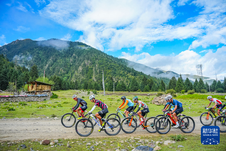 图为2023年环巴松措山地自行车越野竞速赛比赛现场