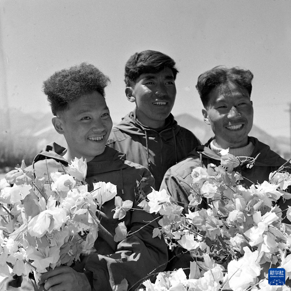 图为登上珠穆朗玛峰顶峰的三名登山英雄。右起:王富洲、贡布(藏族)、屈银华。陈珺摄(新华社稿)