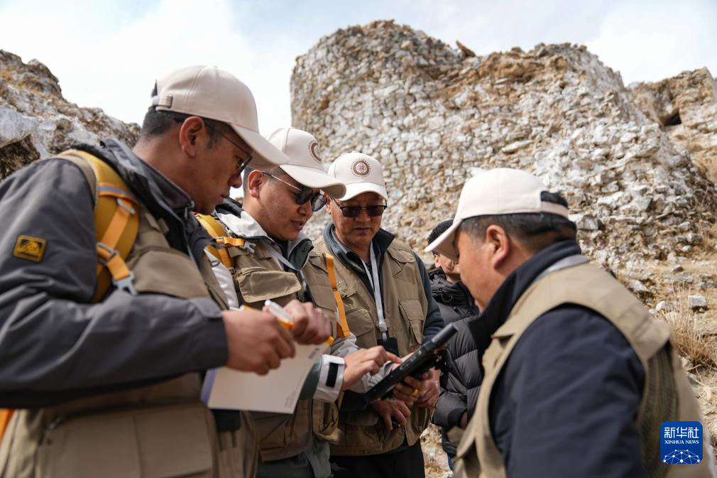 4月11日,普查人员手持移动端数据采集设备在曲果岗塔群遗址现场开展数据采集。新华社记者 晋美多吉 摄