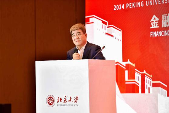图为北京大学校务委员会副主任、北京大学汇丰商学院创院院长、北京大学金融校友联合会创会会长海闻发表演讲。