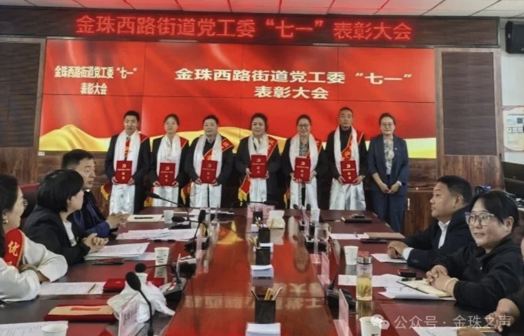 表彰大会上,毛兰勇同志宣读《金珠西路街道党工委关于表彰2025年度优秀共产党员和优秀党务工作者的决定》,街道党工委副书记斯郎平措为6名优秀共产党员披挂绶带、颁发荣誉证书,街道党工委副书记、人大工委主任次仁德吉为6名优秀党务工作者披挂绶带、颁发荣誉证书。