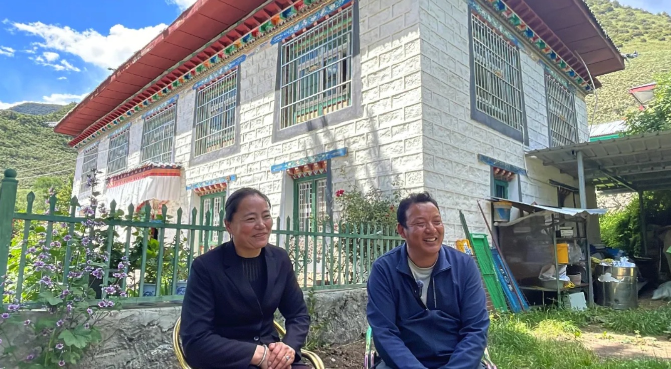 “犬吠水声中,桃花带露浓。”坐在鲜花绽放的美丽庭院内,嘎拉村村民白玛德庆和丈夫旦增尼玛的脸上洋溢着喜悦。