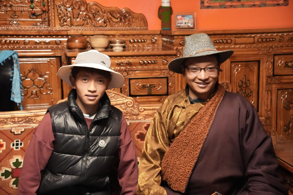 图为村民尼玛(右一)与儿子嘎玛欧珠(9月10日摄)。新华网发 林玥儿 摄
