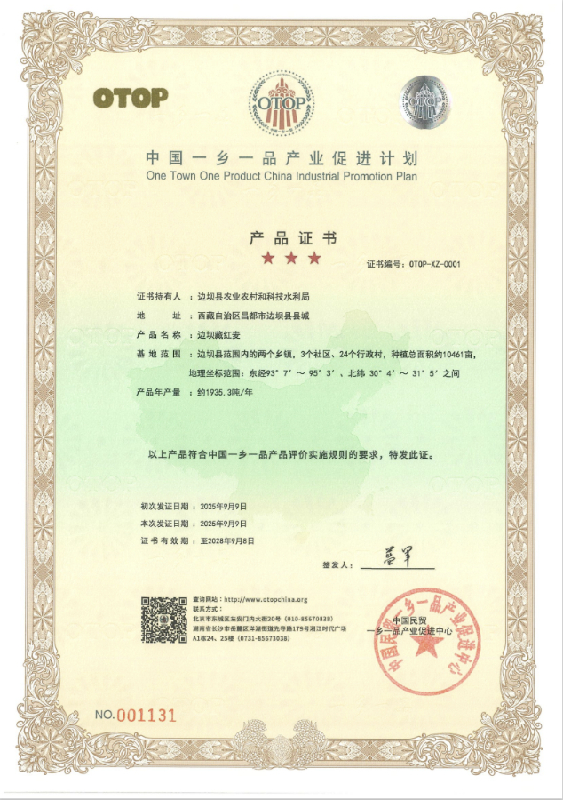经综合评估,专家组一致认为,“边坝藏红麦”在传统特色传承、产业规模拓展、质量水平把控、品牌联农带农等方面均达到“中国一乡一品”认证标准,成功通过现场评审。值得一提的是,此前边坝藏红麦已先后通过绿色认证、成功注册地理标志证明商标、获得有机转换认证证书,并被纳入全国名特优新农产品名录,此次斩获“中国一乡一品”称号,进一步丰富了其品牌“含金量”,实现千年农耕文明与现代质量标准的深度融合。