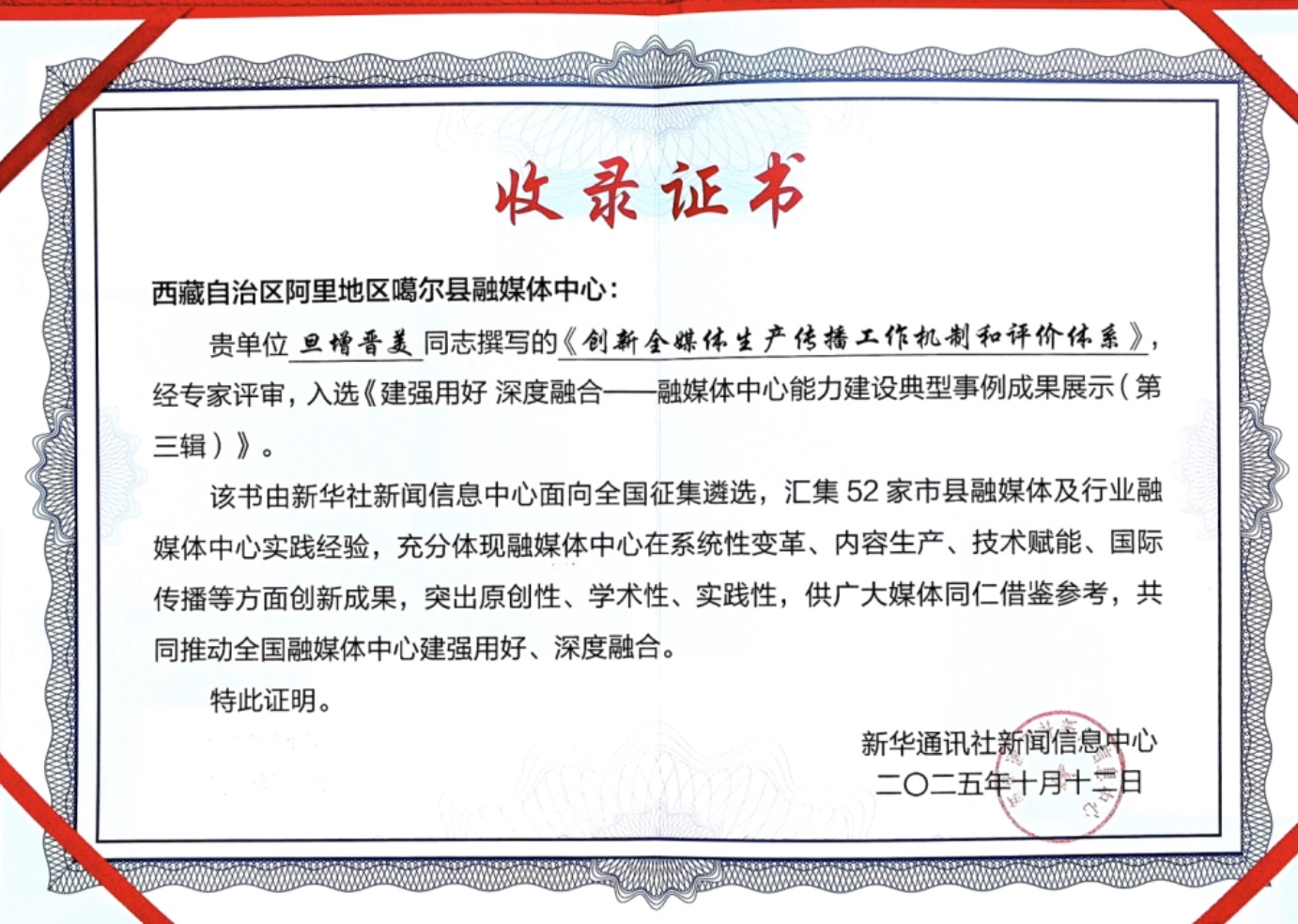 图为阿里地区噶尔县融媒体中心的收录证书。