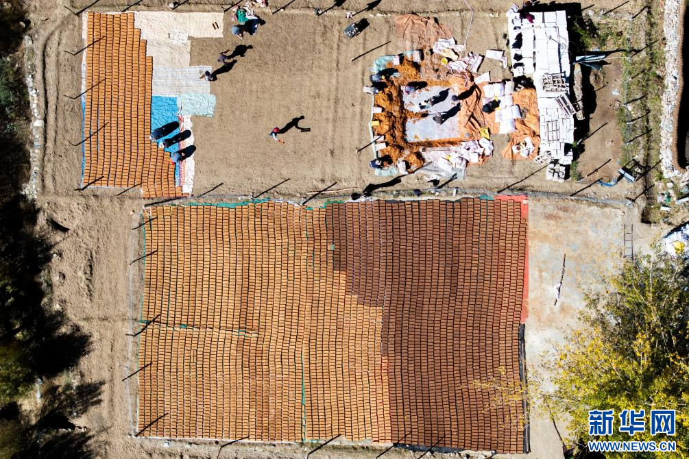 10月17日,西藏拉萨市尼木县吞巴镇吞达村村民把经过水磨后的柏木浆制作成香砖(无人机照片)。新华网 旦增努布 摄