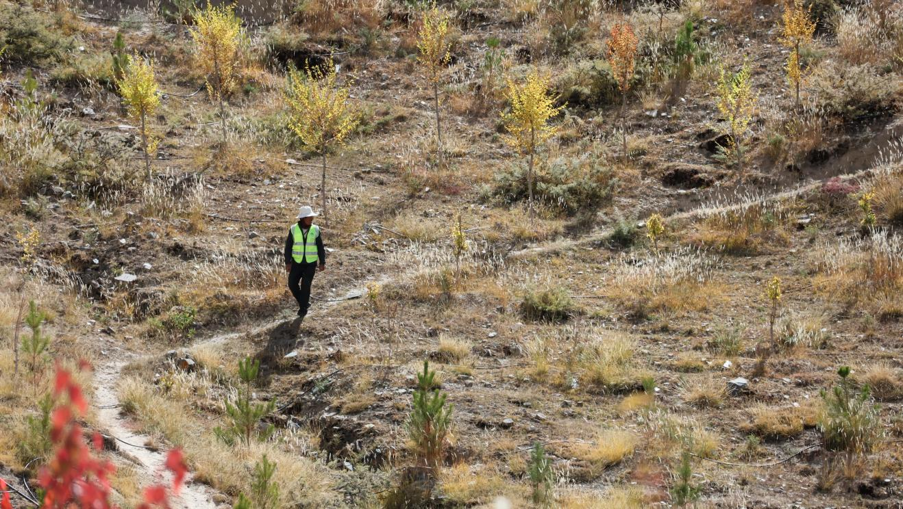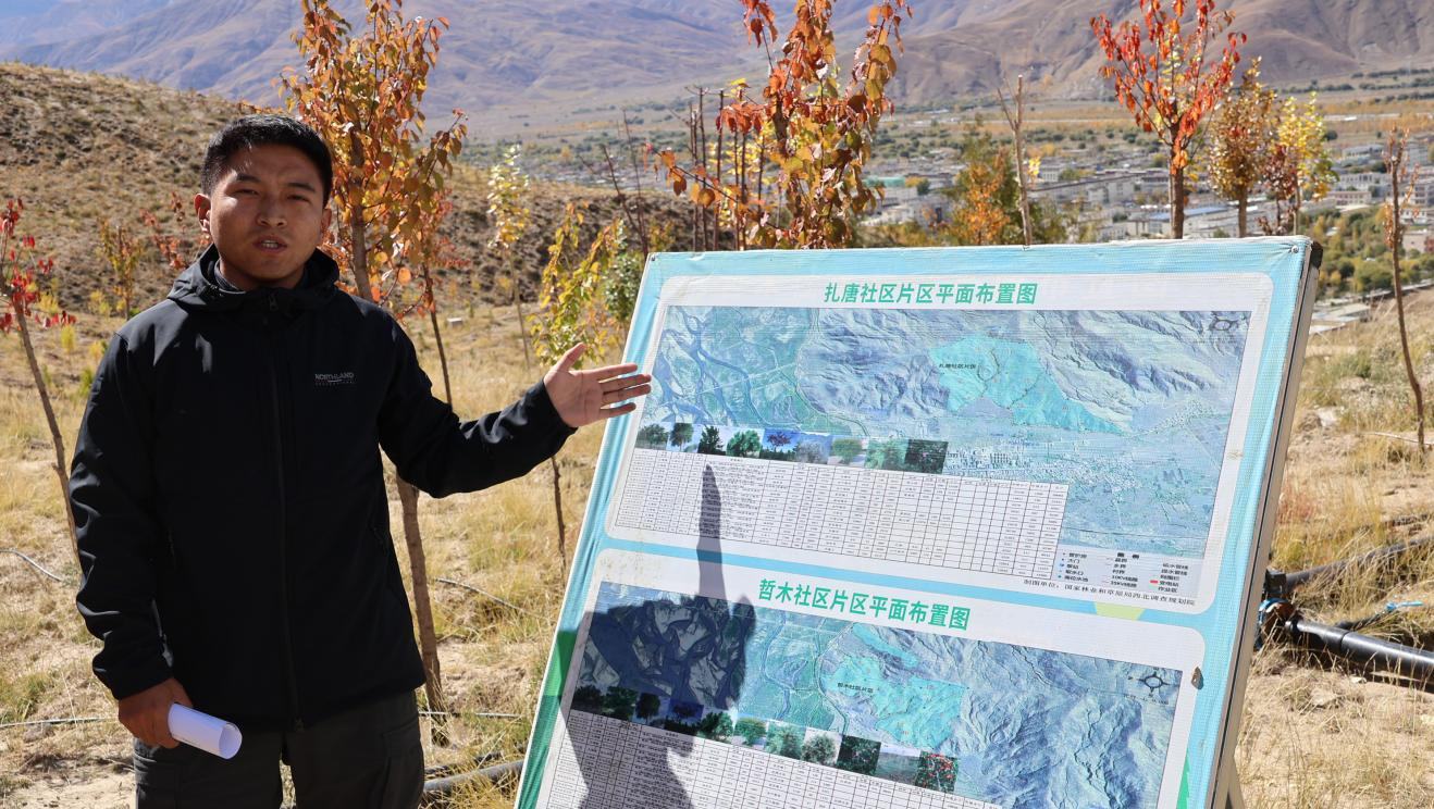 图为县林草局生态修复科工作人员索朗晋宅介绍南北山概况。新华网发 王诗月 摄