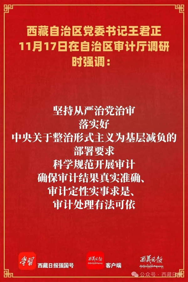 王君正强调,要坚持党对审计工作的领导,持续改进作风狠抓落实,努力开创西藏审计事业高质量发展新局面。提高政治能力,自觉从党和国家工作全局出发思考问题、研究问题,不断增强审计的政治功能和政治属性,推动审计监督更加权威有力。塑造职业精神,敢于坚持原则、敢于动真碰硬,勇于讲真话、说实话,以实际行动践行绝对忠诚、绝对过硬、绝对可靠。建设忠诚干净担当的干部队伍,不断提高专业能力和素养,持续巩固心齐气顺、劲足干事的良好局面。改进作风狠抓落实,巩固拓展深入贯彻中央八项规定精神学习教育成果,坚持从严从简,把过紧日子的思想和行动落到实处,力戒形式主义、官僚主义,推动审计工作迈上新台阶。坚持从严治党治审,落实好中央关于整治形式主义为基层减负的部署要求,科学规范开展审计,确保审计结果真实准确、审计定性实事求是、审计处理有法可依。