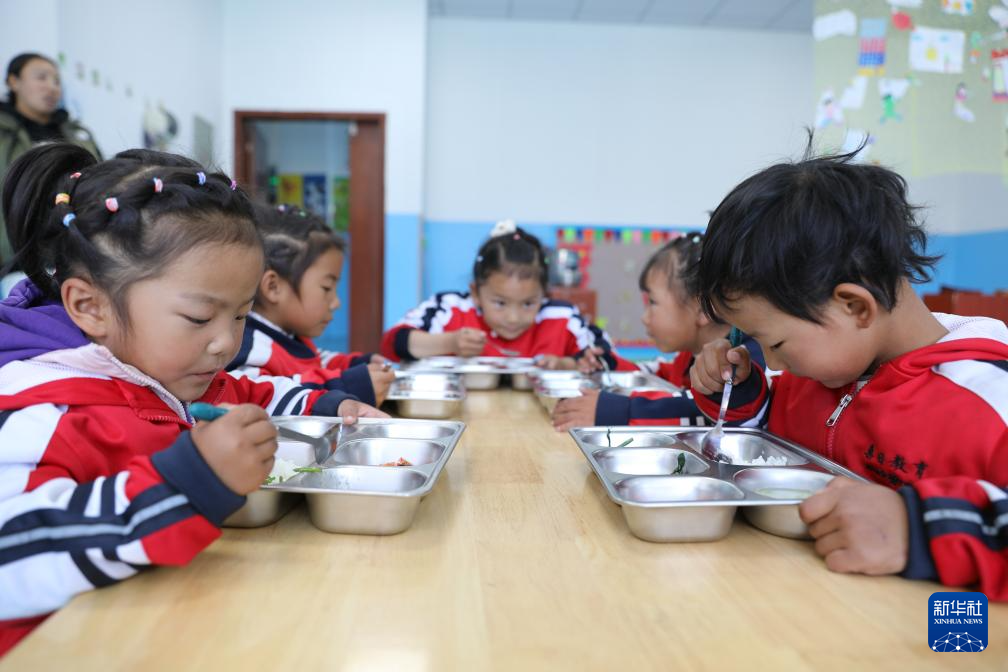 扎嘎新村幼儿园学生正在吃午饭。新华社发(嘉措 摄)