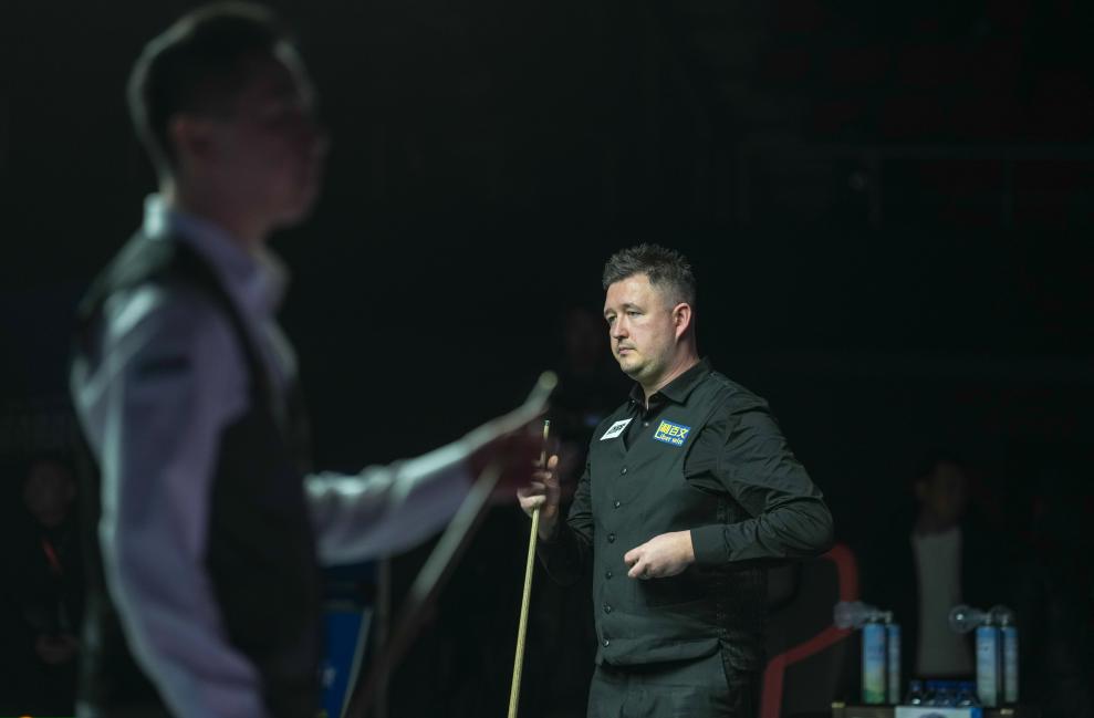 英格兰选手凯伦·威尔逊(右)在2025拉萨冬季高原斯诺克挑战赛比赛中。新华社记者 晋美多吉 摄