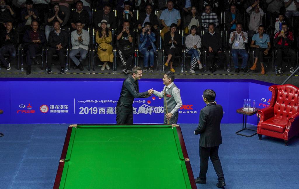 2019西藏斯诺克巅峰对决比赛中,塞尔比(左一)祝贺丁俊晖单杆打出147的满分。新华社记者 晋美多吉 摄