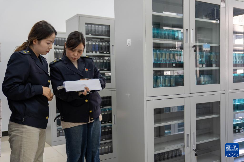 1月6日,拉萨基础设施段电务专修车间继电器检修工区的信号工路东燕(左)和德吉卓玛在检查继电器库房台账。新华社记者 旦增尼玛曲珠 摄