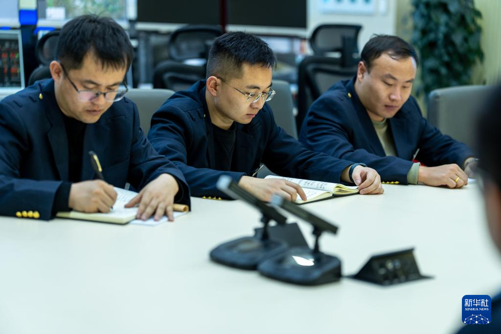 1月6日,拉萨基础设施段安全生产指挥中心电力调度员祁增海(左)、日常调度员赫占荣(中)、电力调度员赵忠林(右)进行业务学习。新华社记者 旦增尼玛曲珠 摄