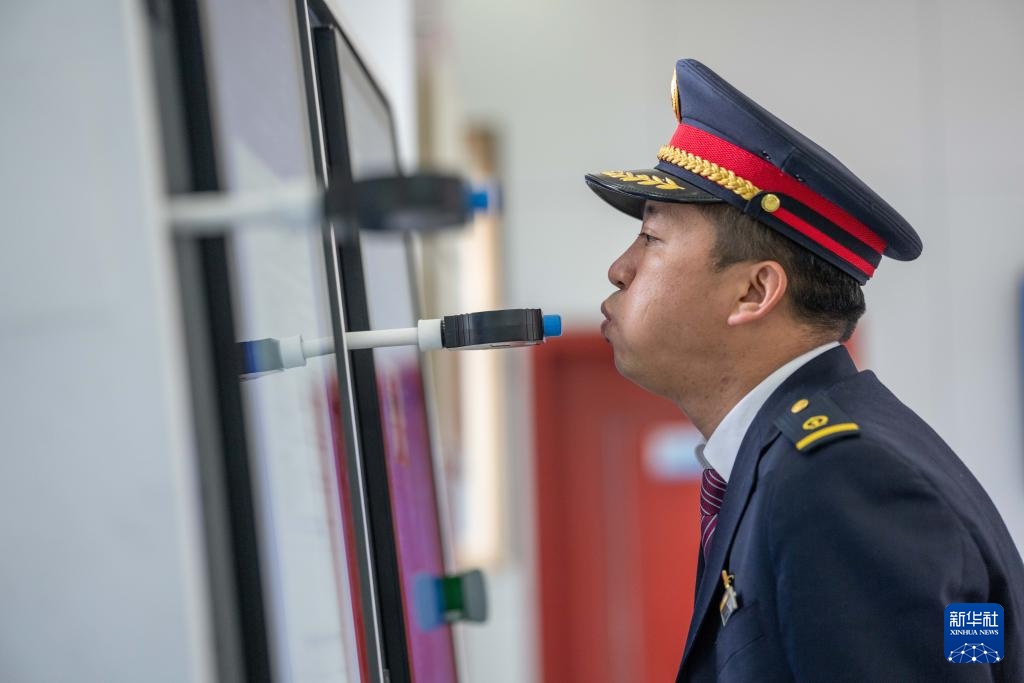2月14日,斯朗旺扎出勤前进行酒精测试。新华社记者 旦增尼玛曲珠 摄