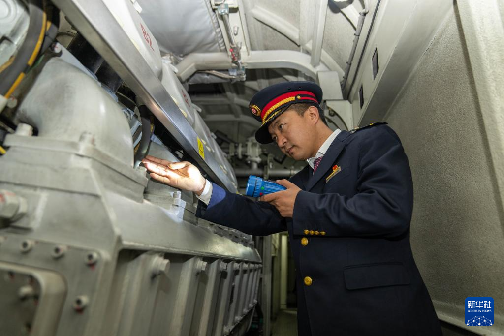 2月14日,斯朗旺扎在检查机车机械间。新华社记者 旦增尼玛曲珠 摄