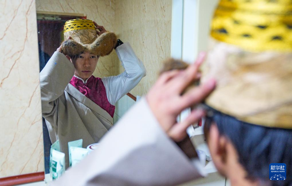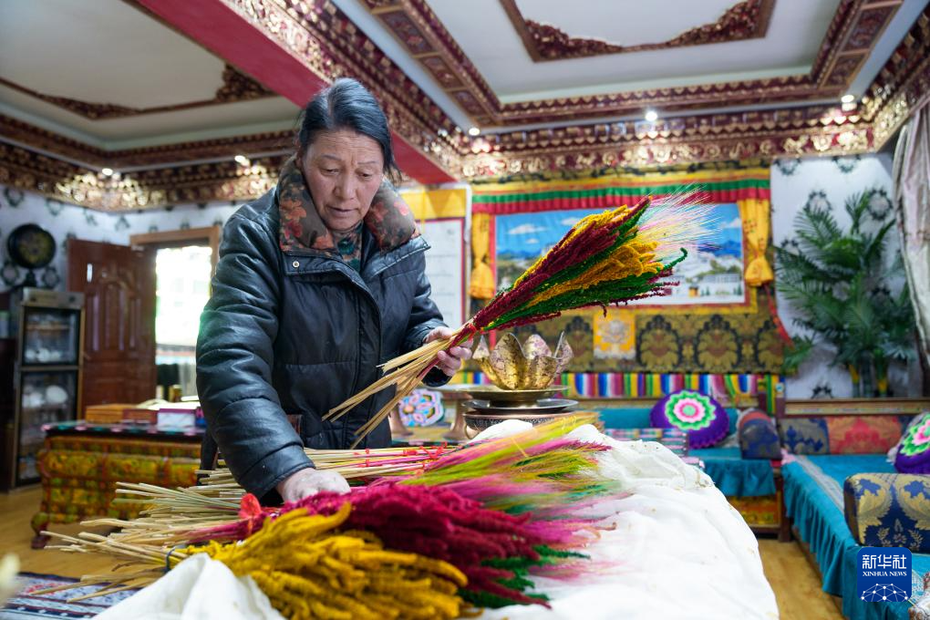 2月16日,在拉萨堆龙德庆区东嘎街道桑木社区,群群的妻子扎桑在整理“罗萨美朵”。新华社记者 丁增尼达 摄