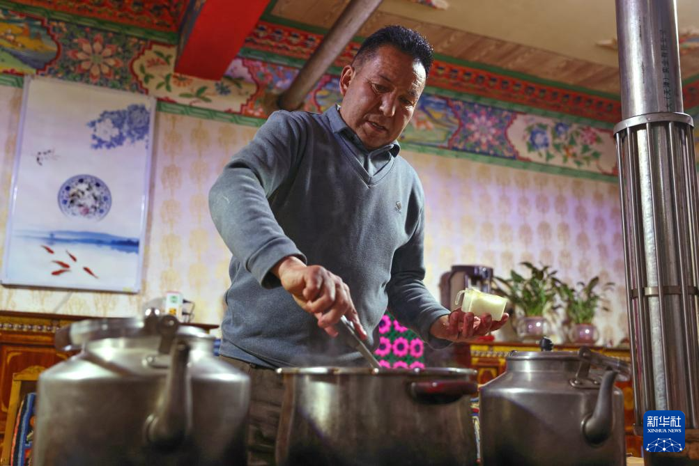 2月16日,在拉萨堆龙德庆区东嘎街道桑木社区,群群在搅拌“古突”。新华社记者 丁增尼达 摄