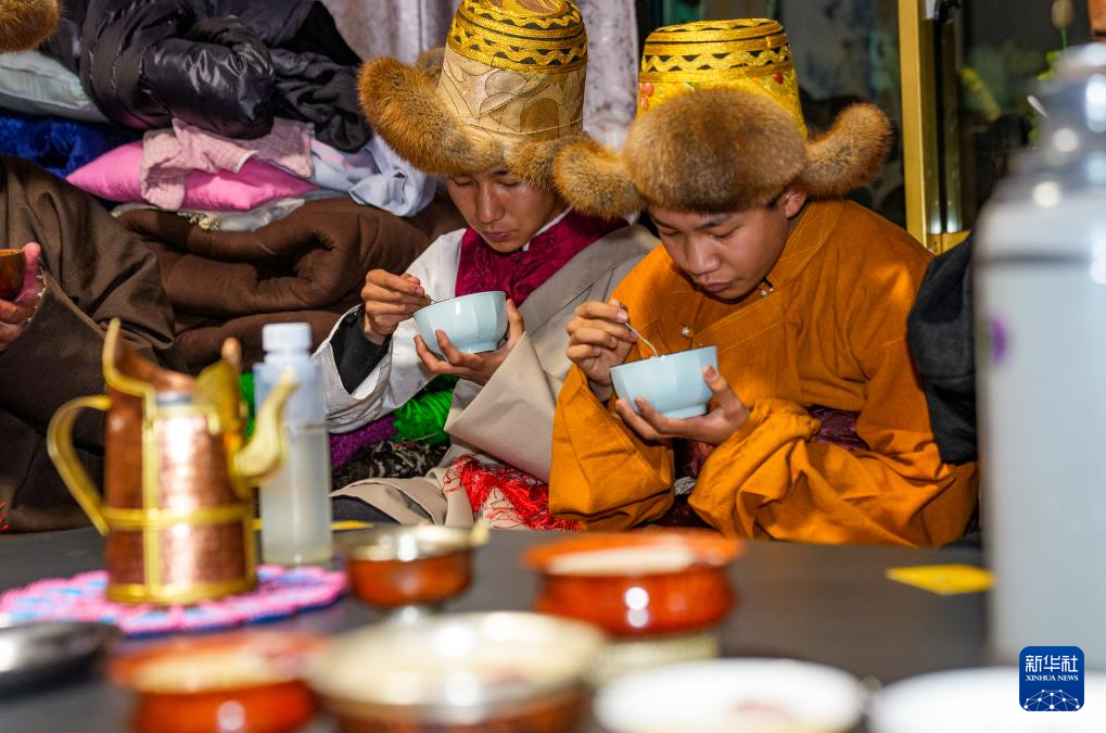 2月16日,在拉萨堆龙德庆区东嘎街道桑木社区,群群一家人在吃“古突”。新华社记者 丁增尼达 摄
