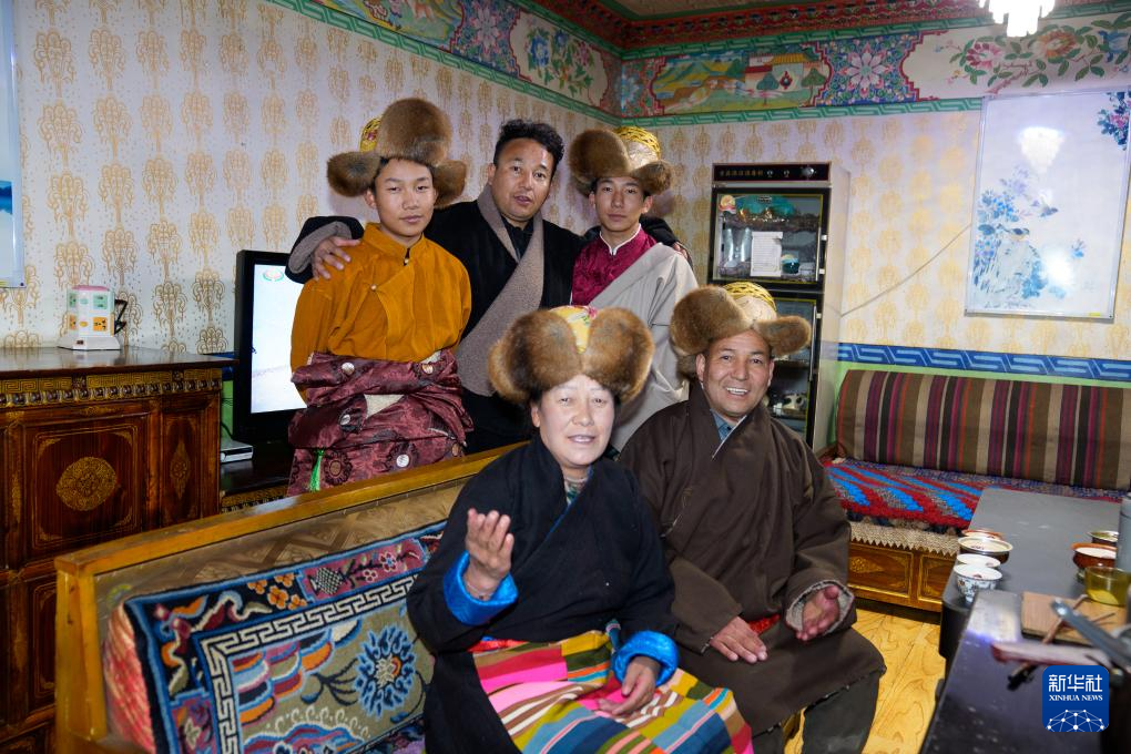 2月16日,在拉萨堆龙德庆区东嘎街道桑木社区,群群的儿子罗桑土旦(后排中)与家人合影。新华社记者 丁增尼达 摄