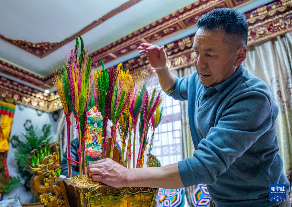 2月16日,在拉萨堆龙德庆区东嘎街道桑木社区,群群在装扮切玛盒(五谷丰登斗)。新华社记者 丁增尼达 摄
