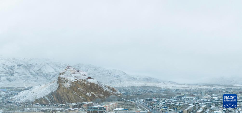 3月13日,空中俯瞰雪后的西藏日喀则市江孜县江孜宗山古堡。