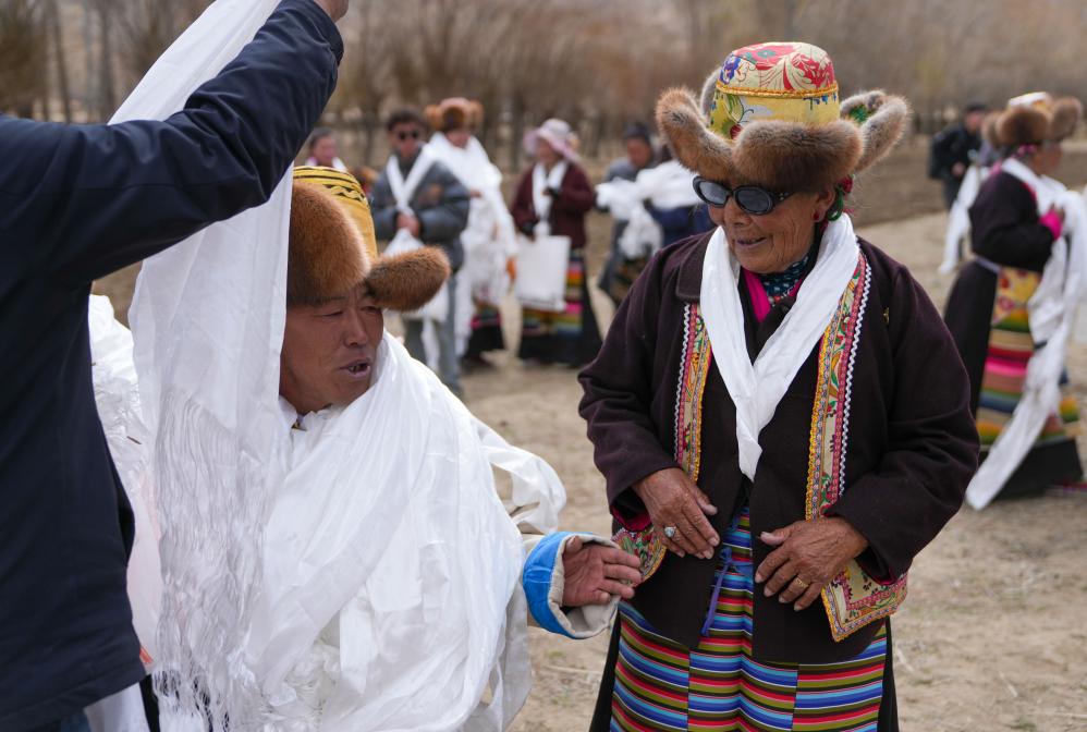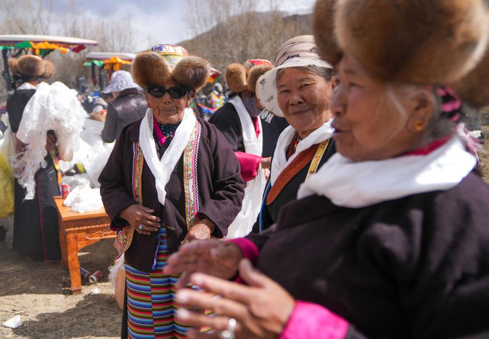 阿旺卓玛(右)在春耕仪式上和乡亲们攀谈(3月16日摄)。